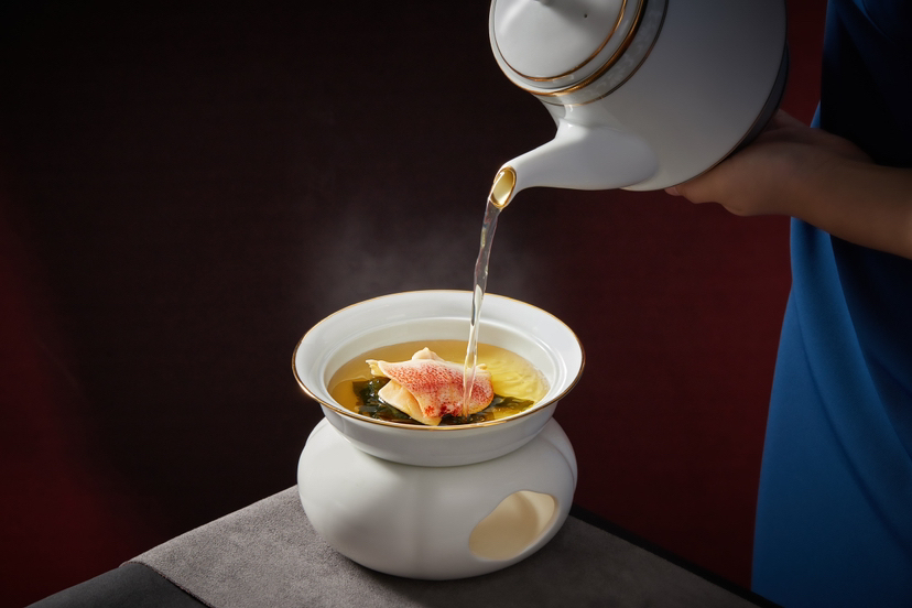再如虾籽麒麟东星斑,熟练的刀工将每一片鱼肉精细切成均匀厚度,精准的火候让鱼肉和珍菌在热力中碰撞、融合,“镬气”十足,香气诱人;鲜海草冲浪蚌仔,厨师用鲜海草和黄油老鸡炖煮的汤底,汤清味鲜,趁热浇在蚌仔肉上,激发出蚌仔的鲜味,蚌片口感脆爽微甘,鲜中带甜。