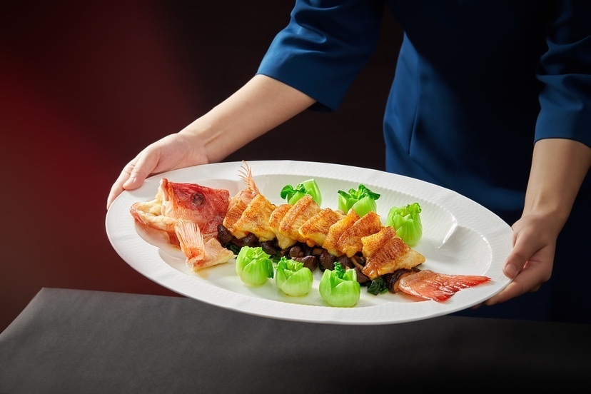 三葱爆波士顿龙虾、老菜脯焗东海大黄鱼、鱼子酱雪地藏龙、虾籽麒麟东星斑和鲜海草冲浪蚌仔等皆是店内招牌。John介绍,三葱爆波士顿龙虾是用紫洋葱、玉葱和干葱三重葱香,与斩件波士顿龙虾以抛镬爆炒,三种葱香交织,龙虾肉弹牙,完全吸收浓郁的葱香,与龙虾的鲜味完美融合;鱼子酱雪地藏龙,则是将龙虾肉过油后捞出,保持肉质脆嫩,蒸蛋白里调入上汤,使口感更嫩滑,一抹黛色鱼子酱点缀在雪白的虾球上,即可提鲜又带来浓烈的色彩碰撞。