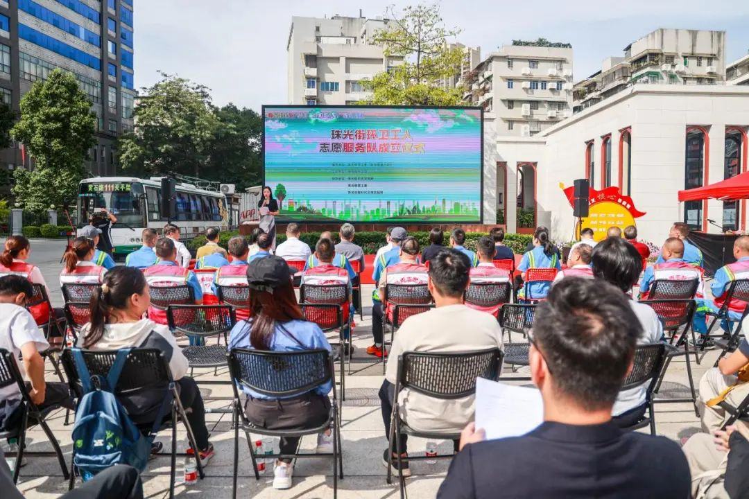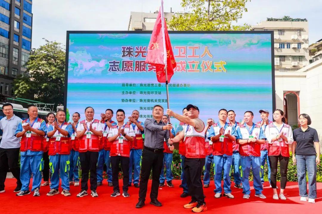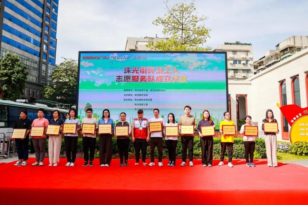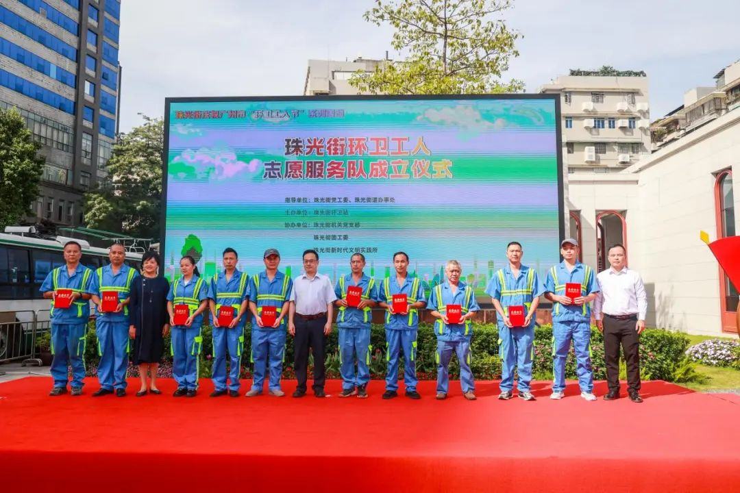 近日,在珠光街党工委、珠光街道办事处的指导下,越秀区首支“环卫工人志愿服务队”在团一大广场举行成立仪式。据了解,这支志愿服务队由18名来自一线的环卫工人组成,包含5名党员,成员的年龄跨越老中青三代,既有经验丰富的58岁环卫老大哥,也有活力满满的90后环卫小哥。他们既是城市的美容师,也是传递爱心的志愿者。