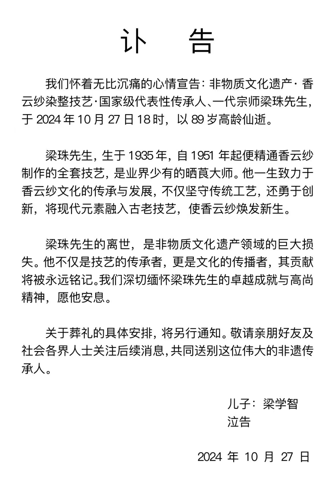 记者从梁珠先生家属处获悉,国家级非物质文化遗产香云纱染整技艺代表性传承人梁珠先生于2024年10月27日18时与世长辞,享年89岁。