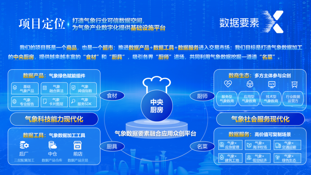 推进气象高价值数据集的安全高效流通使用,离不开社会众创参与及工具平台支撑。据介绍,针对气象数据专业性、复杂性、涉及行业多、融合挖掘难等痛点,《广东省气象数据要素融合应用众创平台》项目发挥气象新质生产力在“数据”“科技”两方面的行业优势,打造气象数据要素融合应用“中央厨房”,对气象数据资源“食材”进行精加工,提供气象专业算法等“厨具”,吸引数商“厨师”众创开发气象服务场景应用“名菜”。