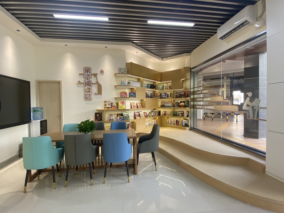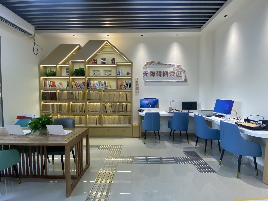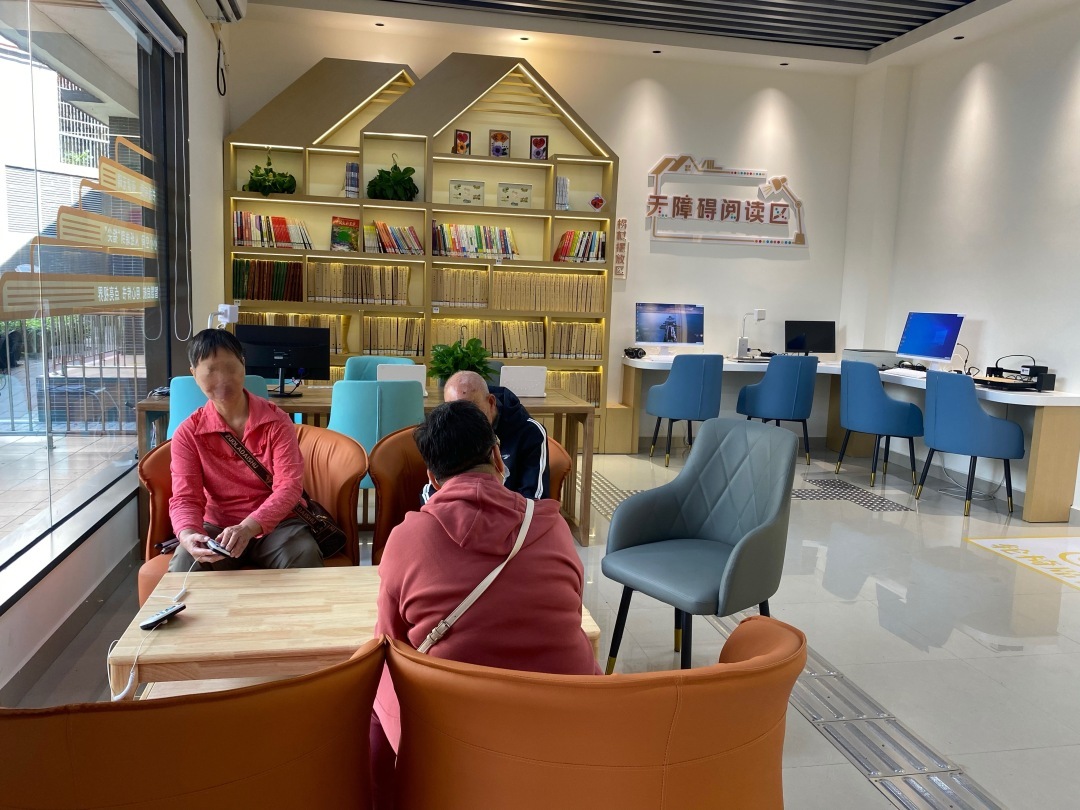 小小的空间充满了贴心的细节:左拐第一处便来到沙发区,圆弧形的沙发、往里伸的沙发腿、圆弧茶几角,都是为了防止磕碰,听书机被固定在茶几的四个角上,方便拿取;再往里是书桌区,电子助视器、智能阅读器、无障碍电脑、盲文学习机等无障碍设备帮助视障居民看书、听书,学习盲文以及上网;最里则是一排书架,摆放盲文书籍和其他种类书籍共500多册,涉及儿童教育、科普教育、健康教育等类别,由广州图书馆等组织机构提供。在这里,阅读以更加便捷的形式、更多元的姿态走进这一特殊群体的世界,激发他们热爱生活、融入社会的热情。