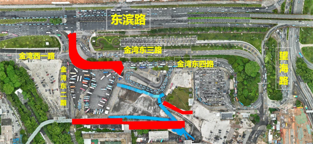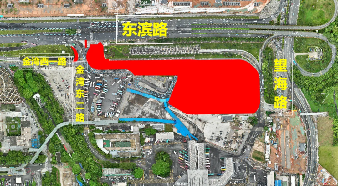 3、开放旅巴接驳区和网约车落客区,封闭金湾东三路、现社会车停车区、现公交车接驳区等区域施工: