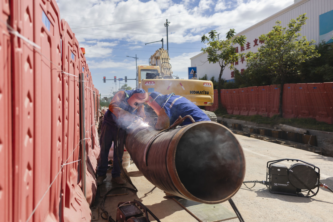 当天上午,在燃气管线项目施工现场,两名焊工戴着面罩,手持焊枪,正在对管沟上已组对好的两条长12米、厚14.2毫米、直径50厘米的燃气管道进行焊接。“每次焊接厚度约两毫米,冷却打磨后再继续焊接,一个焊口需重复上述步骤7次左右,每个焊口用时一小时方可完成。”广州燃气集团工程中心现场管理人员表示。管道焊接完成,待冷却二十四小时后经无损检测拍片合格、完成焊口防腐处理后才能下沟回填。