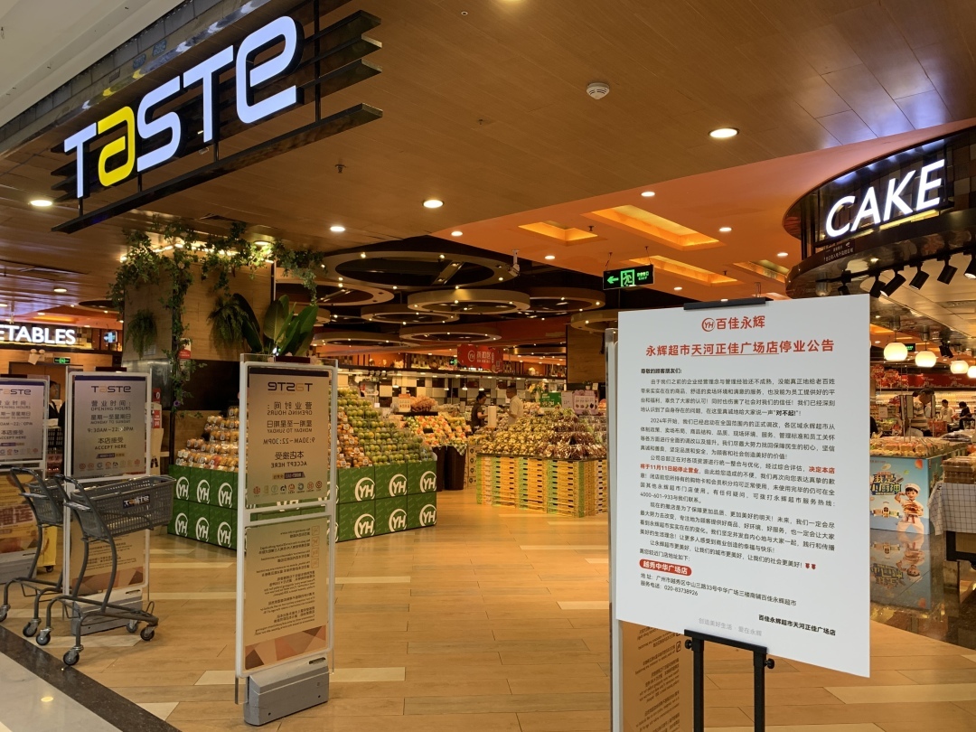 位于在正佳广场负一层的百佳永辉超市,已经在门口张贴停业公告。