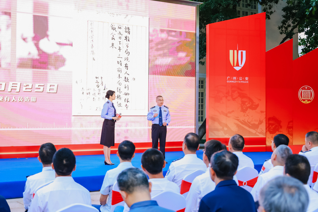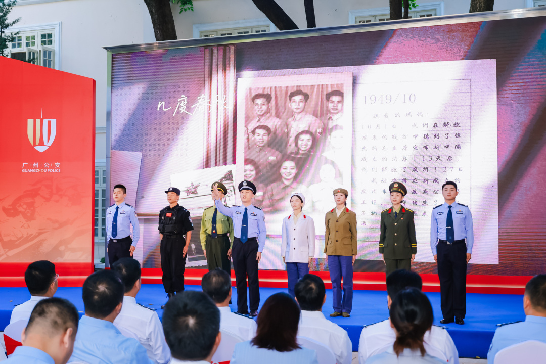 其中,在故事讲述融合情景表演环节,新警们通过讲述广州公安不同时期6位代表人物的故事,展现广州公安不同历史时期的创新发展举措。