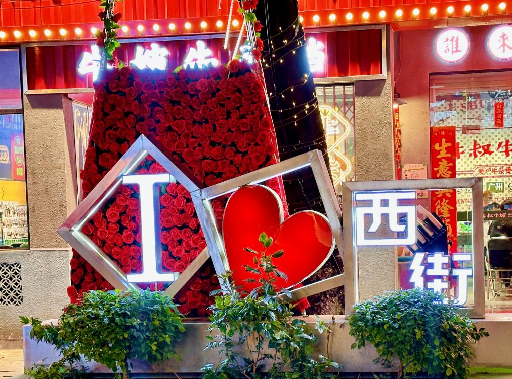 在打造过程中,大市社区联动广州市紫羽文化艺术传播有限公司专业团队充分发挥其艺术创意和制作能力,将原本单调的墙面运用布艺玫瑰花进行装饰装点成了艳红的玫瑰花墙。每一朵玫瑰都栩栩如生,仿佛散发着淡淡的香气,“I LOVE西街”字样,吸引了众多市民和游客驻足观赏、拍照留念。