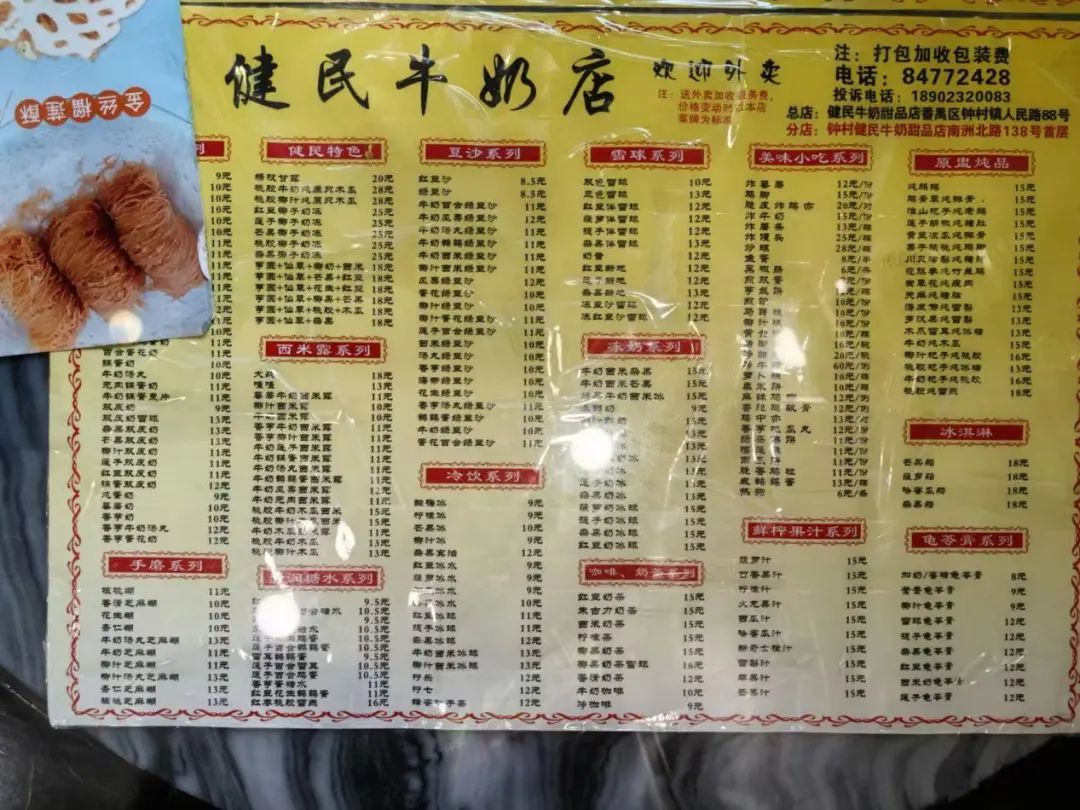 从钟村街人民路往里走,沿着旧牌坊街区,经过陈伍记烧腊,当记者踏入健民牛奶甜品店时,扑鼻而来的阵阵奶香沁人心脾。店内食品品种多样,涵盖甜品、煲仔饭、粥、小吃等,从传统经典到创新口味应有尽有,价格从8元到50元不等,性价比较高,吸引着络绎不绝的街坊食客前来品尝。
