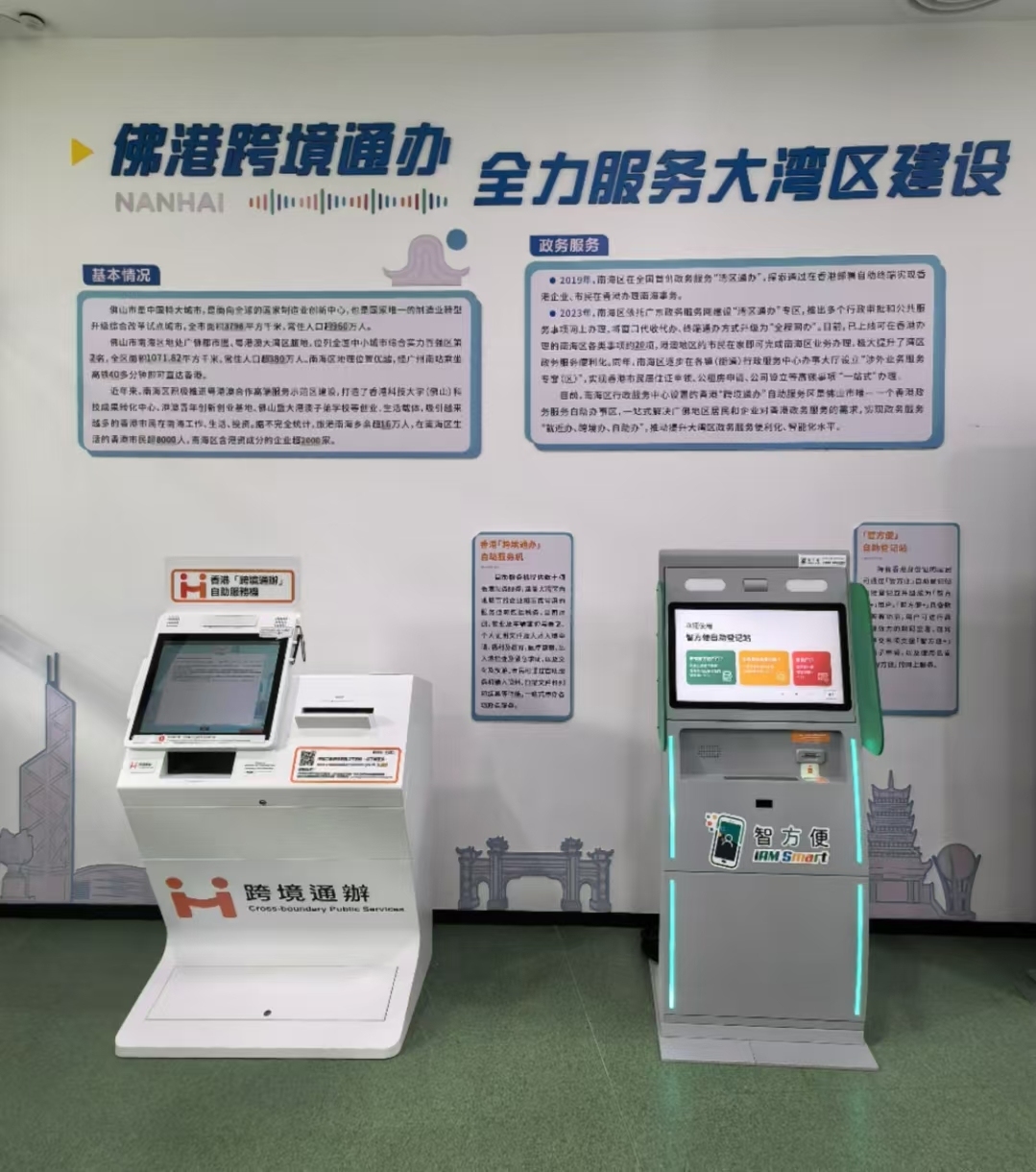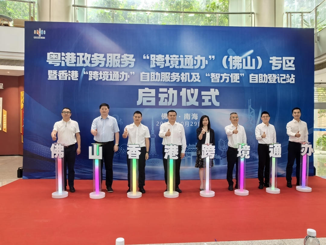 10月29日,香港“跨境通办”自助服务机及香港“智方便”自助登记站启动仪式在佛山市南海区举办。即日起,市民可前往南海区行政服务中心一楼大堂24小时自助服务区内,使用香港“跨境通办”自助服务机办理70项香港政务服务。