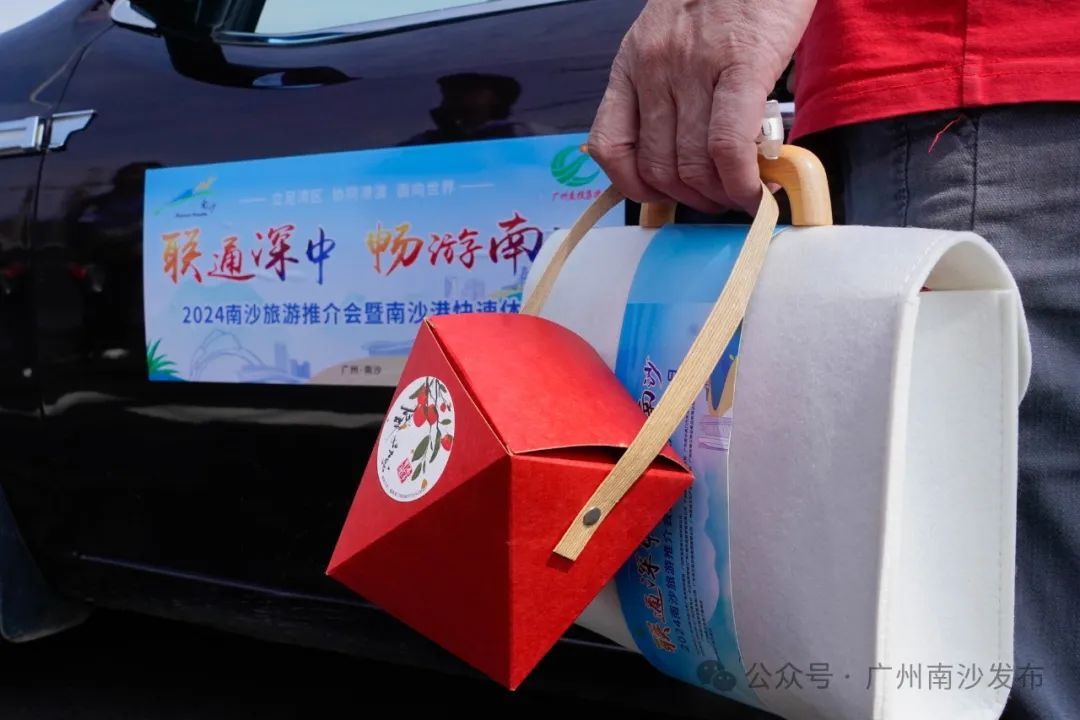 到达南沙联络线后,他们收到来自南沙的神秘礼包,其中不仅有寓意着事事如意的香云纱“柿子”香包、杂粮饼、陈皮豆沙饼和手工香皂,还有一本设计别出心裁的南沙文旅护照。这本文旅护照,将指引车友们打卡南沙天后宫、南沙湿地、十八罗汉山等知名景点。