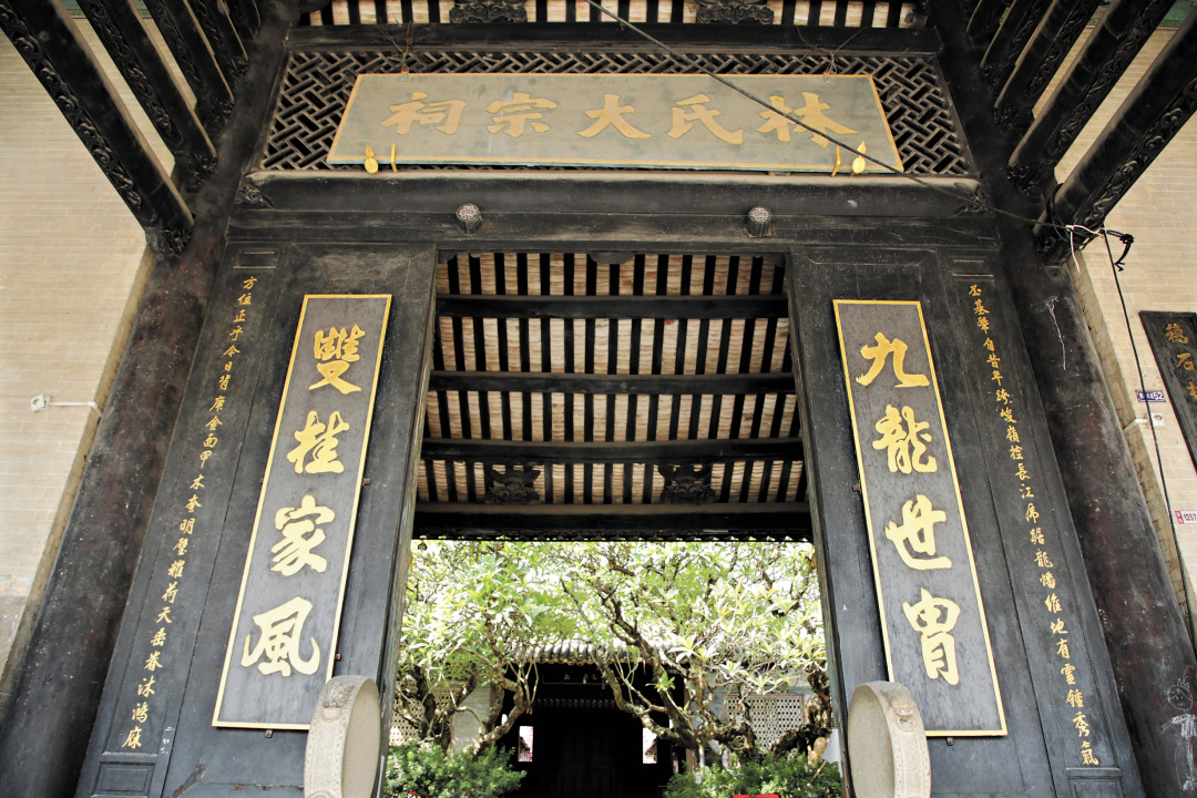 走进穗石村,林氏大宗祠正在维修,两扇大门上画有高大威武的门神——秦叔宝和尉迟恭,两侧有一副对联,上书“九龙世胄双桂家风”,说的是先祖中有两兄弟同时中举,两代人九子同时在朝中做官的故事。91岁的村民林铭康介绍,曾有福建同宗在电视上看到穗石村的这副对联,一下子惊呼起来,发现两地林姓系出同源。
