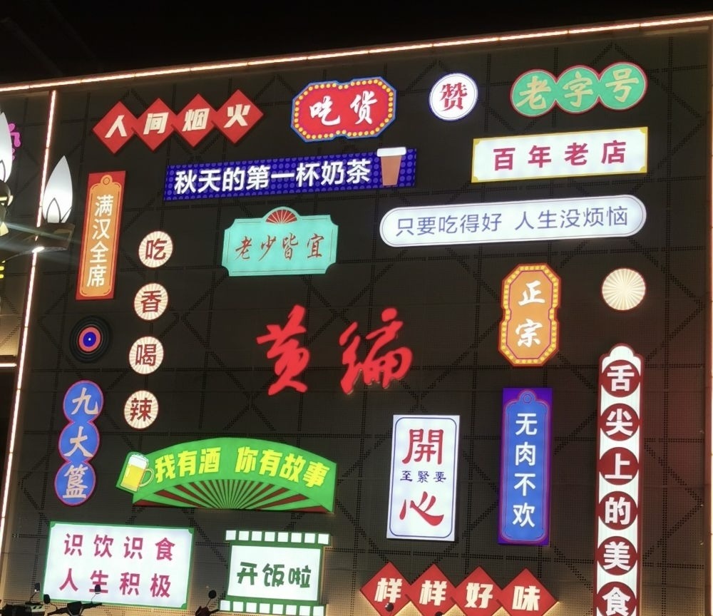 这里的餐饮店大多营业时间较长,主要做夜宵生意,不少店铺甚至通宵营业。夜晚的黄编食街灯火辉煌,热闹非凡,数十家餐饮店聚集于此,路灯与店铺灯箱广告招牌相互映衬,散发出浓浓的烟火气。
