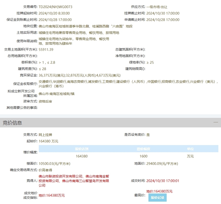 佛山楼市利好政策不断,土地市场也开始活跃起来。10月30日下午,佛山市联资投资开发有限公司、佛山市南海金智投资有限公司、佛山市南海三山智慧岛开发有限公司以164380万元联合摘得桂城石𬒔“六亩围”地段地块,折合楼面价约10500元/㎡。