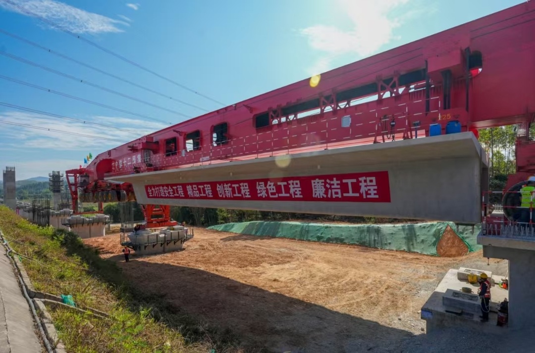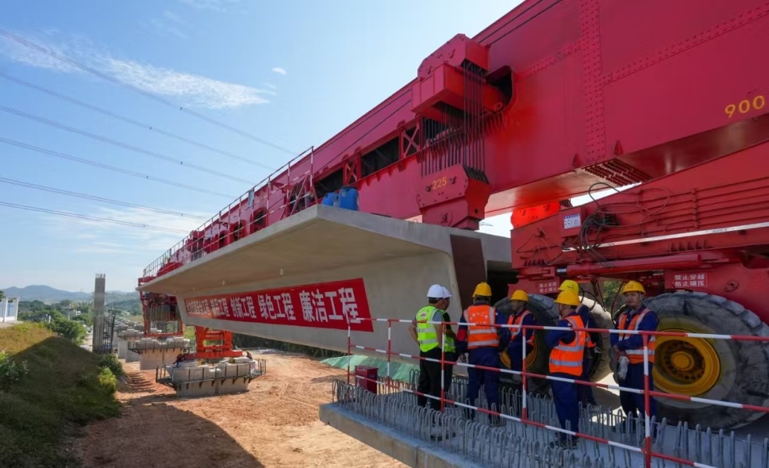 10月30日上午10时58分,随着一榀长32.6米、宽12.6米、重达724吨的预制双线箱梁平稳架设在深汕高铁下北村特大桥桥墩上,深汕高铁全线首榀箱梁成功架设。这标志着深汕高铁建设取得重大进展,全线转入架梁施工阶段。
