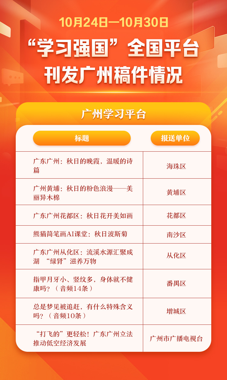10月24日—10月31日,“学习强国”广州学习平台共有30个稿件(含音频集)被全国平台选用。