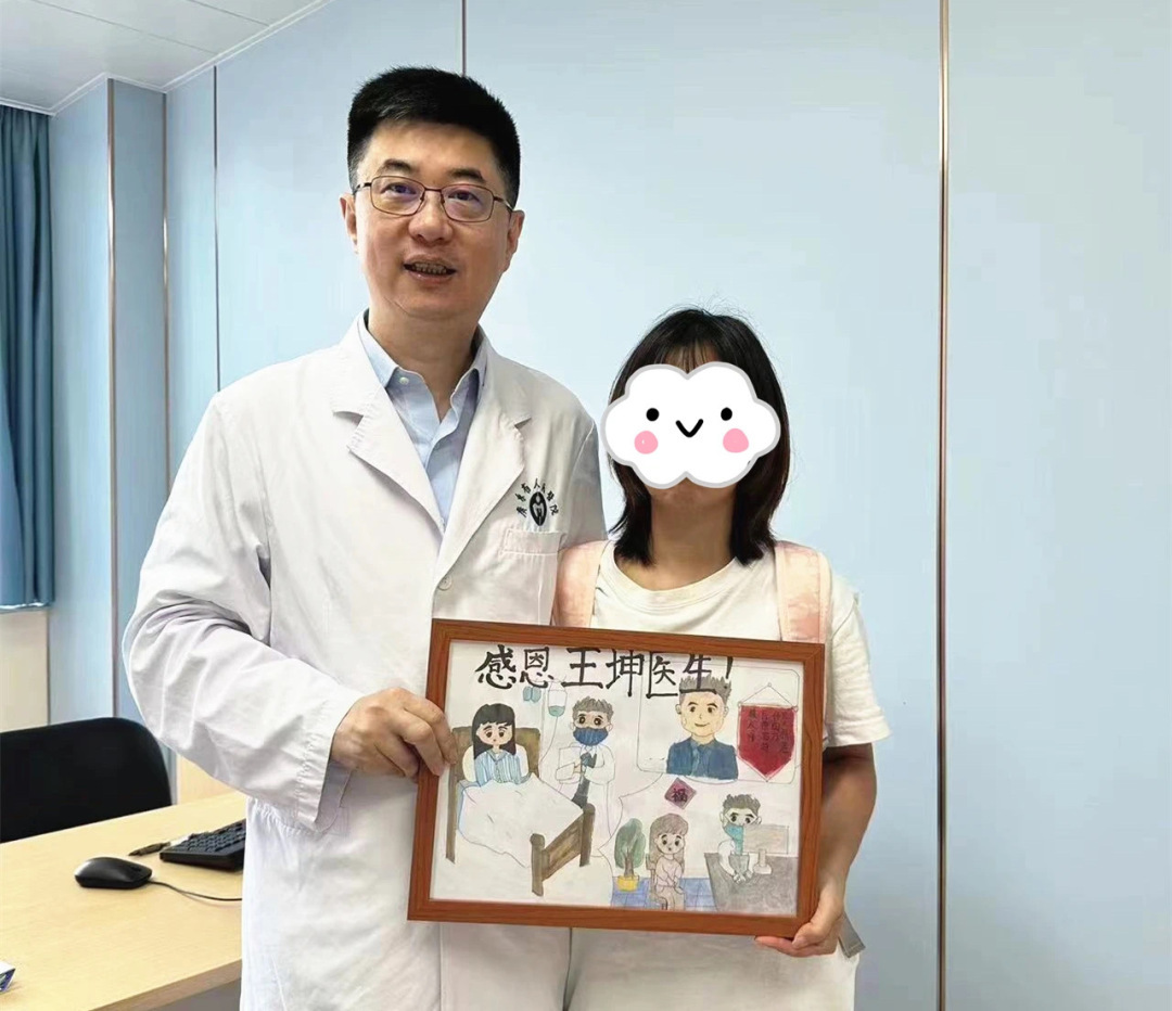 一眨眼,十年过去了,在小陈的照顾下,在一个完整的家庭里,两个女儿长到14岁、11岁。“他说‘让我看着我的孩子长大’,他真的做到了!”每每想到这儿,小陈都会激动得热泪盈眶。她带着大女儿为王坤教授创作的漫画上门诊复查,并且致谢彻底治愈自己的“超人医生”。