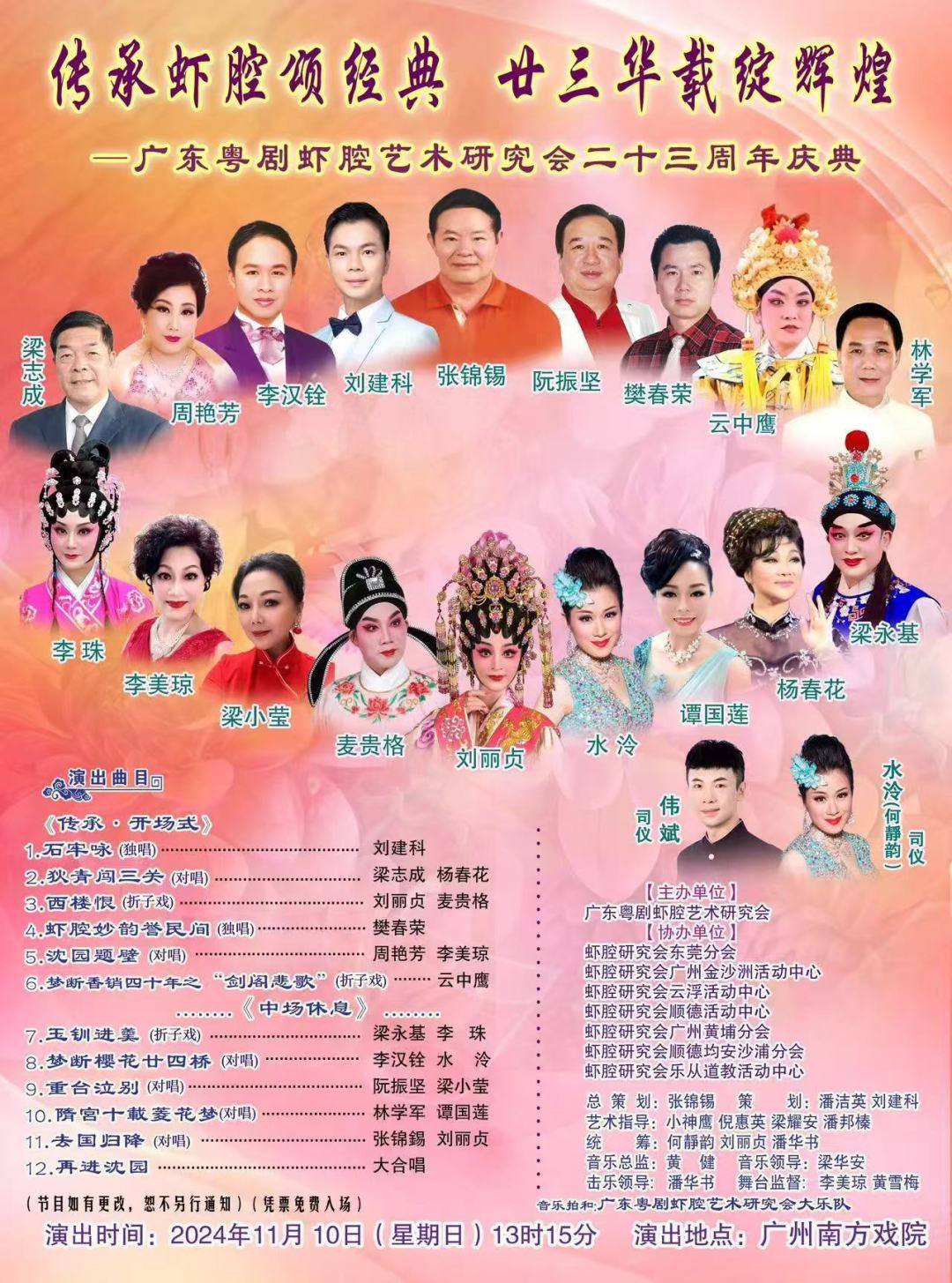 11月9、10日,广东粤剧虾腔艺术研究会23周年庆典将在广州南方剧院盛大举行。本次活动由广东南方文化发展有限公司主办,广东粤剧虾腔艺术研究会、广东粤剧院二团协办。