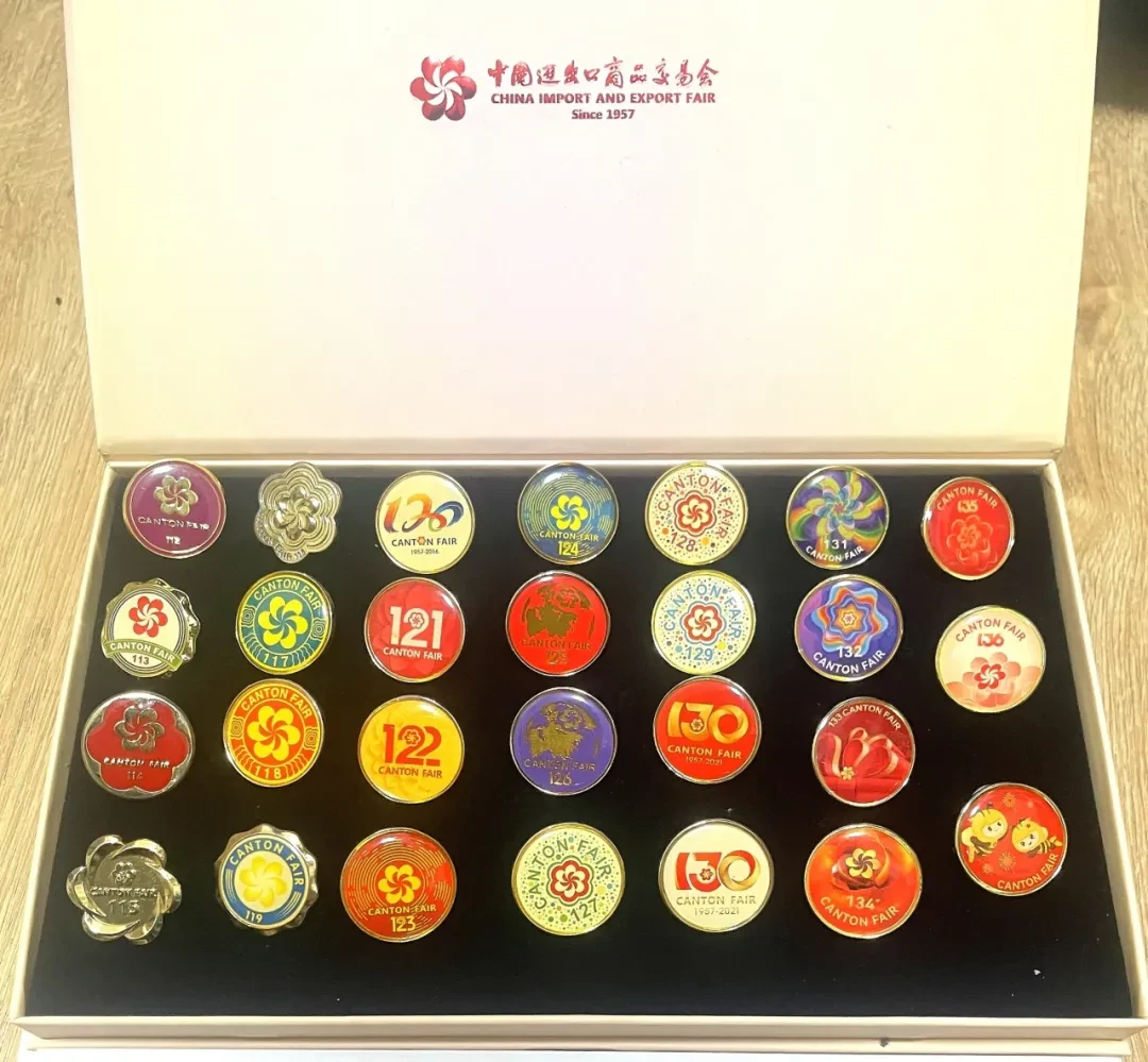 作为一名“老广交”,这么多年来,李媊也自然囤了不少好东西——广交会纪念徽章。在她家中,一个专属定制的盒子里挂满了徽章。“我有最早的广交会徽章,因为很喜欢,觉得很有纪念价值,就一直收藏着。”原来,广交会徽章是广交会的一种纪念品,从2012年第112届广交会开始,组委会开始设计制作系列纪念徽章。
