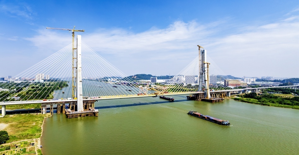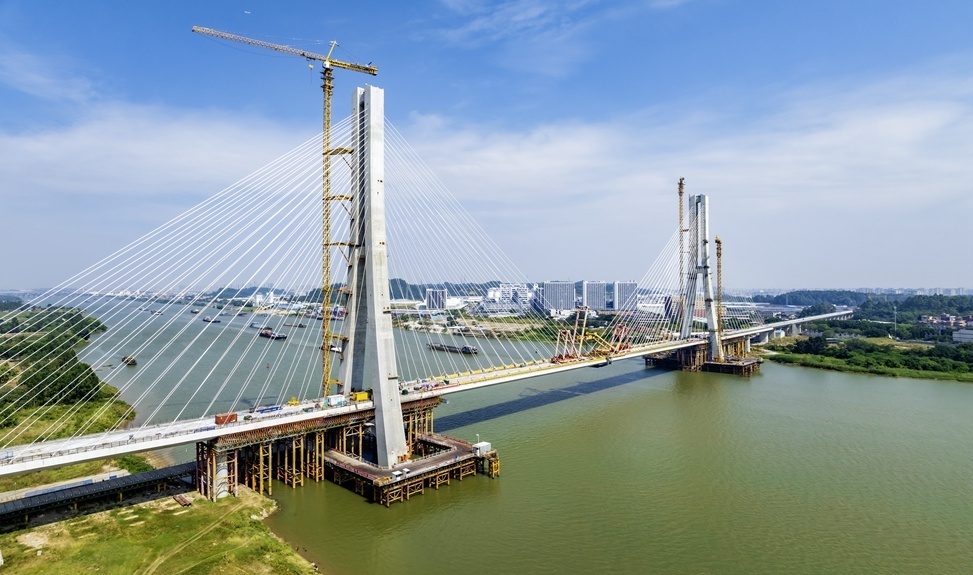 广湛高铁佛山特大桥是全线控制性工程,位于佛山市南海区、三水区和高明区境内,全长15.652公里。佛山特大桥有“桥梁小博物馆”之称,是集斜拉桥、系杆拱桥、钢混刚构桥、转体连续梁桥、普通连续梁桥、预制简支箱梁等于一体的大型综合性桥梁,桥梁种类多、结构复杂。此次合龙的跨东平水道斜拉桥全长725米,为主跨350米双塔双索面钢-混(钢筋、混凝土)混合梁斜拉桥,是一座科技攻关型现代化桥梁,建成后将成为世界最大跨度时速350公里高速铁路无砟轨道钢混混合梁斜拉桥。