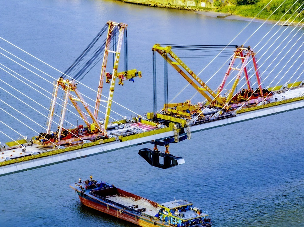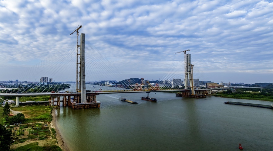 孙军介绍,施工过程中,项目团队始终将科技创新置于核心位置,高质量、高效率推进大桥建设。在深水超大哑铃型承台施工中,项目技术团队研发了国内首创的“双壁钢围堰+锁扣钢管桩围堰”组合式围堰,分区域施工再连通成整体围堰的施工工艺,有效克服了浅埋砂岩地质大型承台钢围堰设计和施工难的问题;运用BIM技术对每节段主塔结构尺寸进行模拟,实施精准环向预应力管道定位和索道管定位,确保带弧A形主塔施工精度;研发并应用结合梁钢梁架设与桥面板安装异步施工工法,大幅提升了施工效率,缩短了整体建设周期。此外,采用自动数据采集系统,严格主梁线形控制,通过对施工荷载、温度、风载等数据实时采集、动态分析,确保主桥精准合龙,为后期无砟轨道线形控制提供可靠条件。