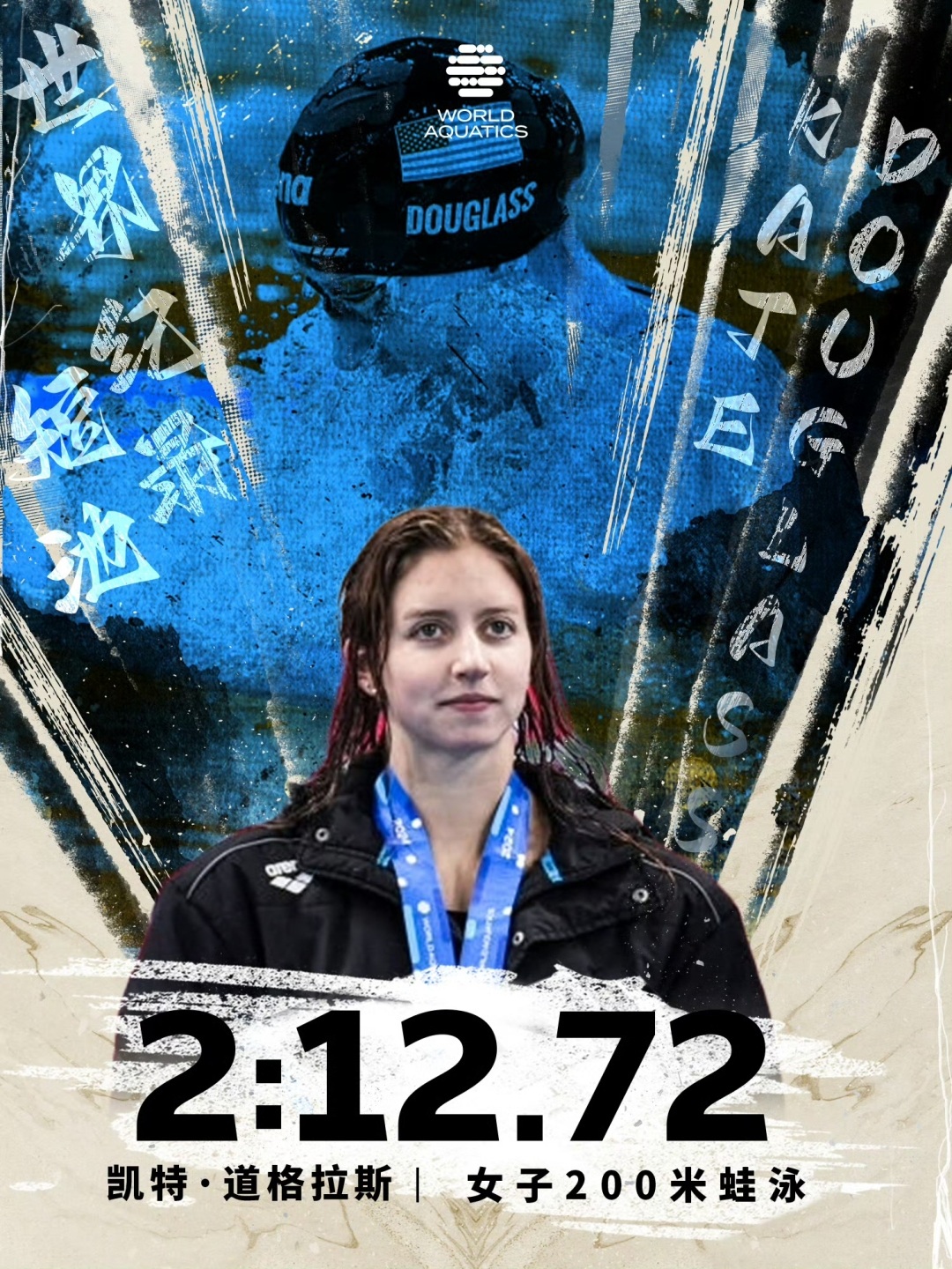 此外,美国选手道格拉斯连续两站世界杯打破世界纪录,项目是女子200米蛙泳,她今天的夺冠成绩为2分12秒72,比她个人几天前创造的新世界纪录又快了超过1秒,实力惊人。