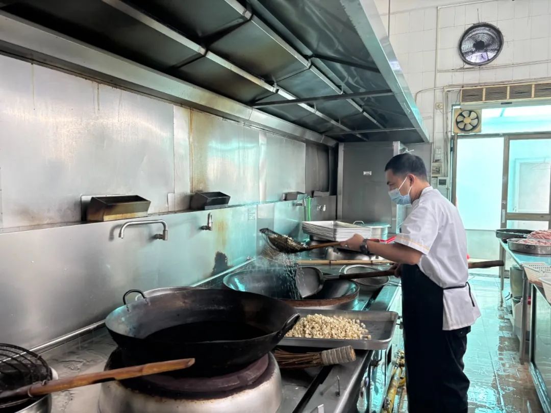 在街道饭堂掌厨的胡锦威师傅,大家都亲切地叫他威师傅,他19岁开始学厨,开始是在厨房做“打荷”,在学厨初期主要负责厨房杂活,原料腌调味、上粉上浆、用炉子烹制、协助厨师制作造型等,看似简单,其实是厨房里面的一个全能选手,什么都需要了解。他对烹饪有着浓厚兴趣,四年时间后,他已经成为厨房的主厨。