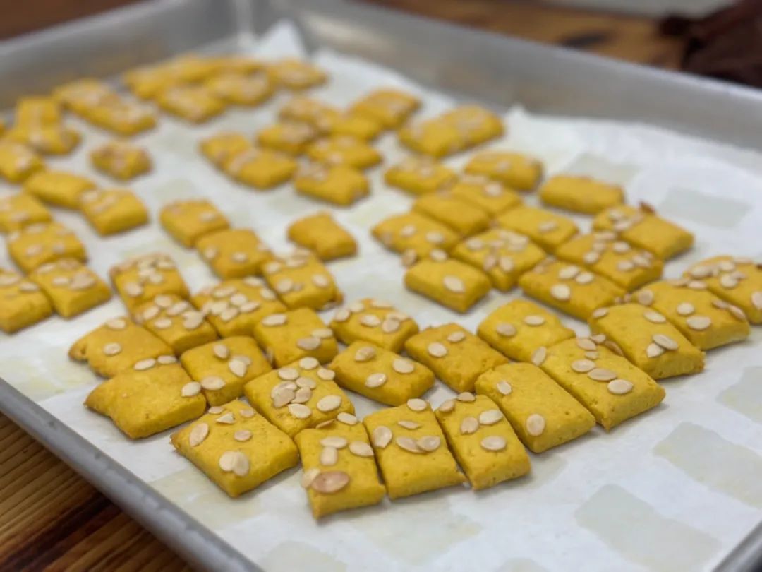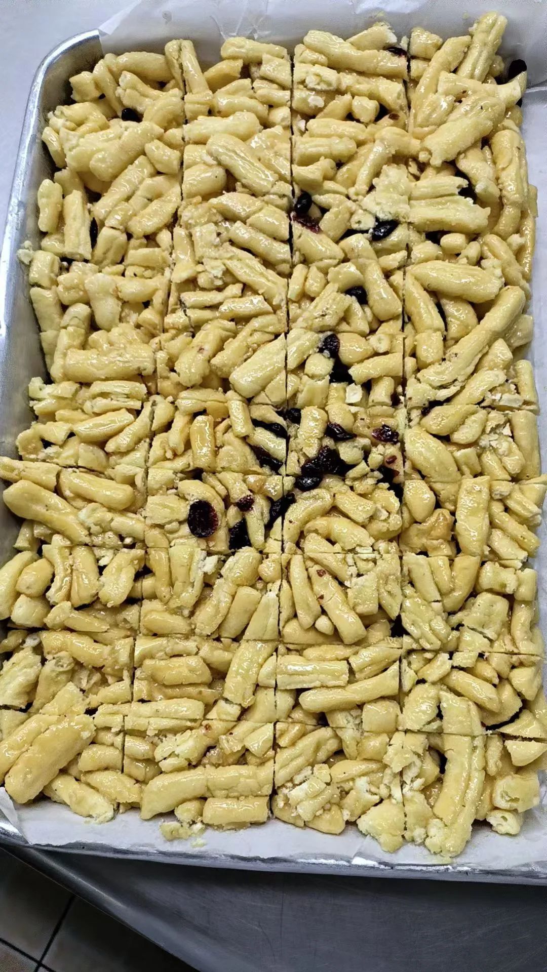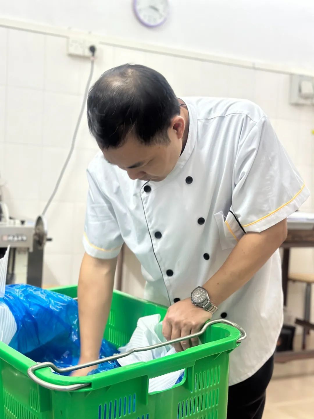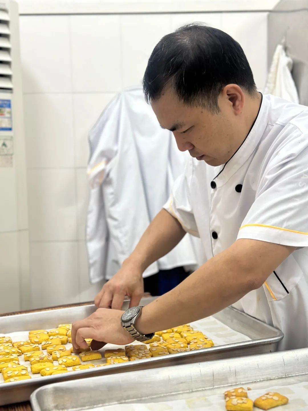 近日,食堂常常传来阵阵香味,原来,威师傅在研究新的菜品,他在做西式点心。威师傅的工作时间是早上5点到14点,他每天5点到食堂,开始准备一天的菜品,14点下班,但是为了研发更多的菜品,他经常到16、17点才回家。