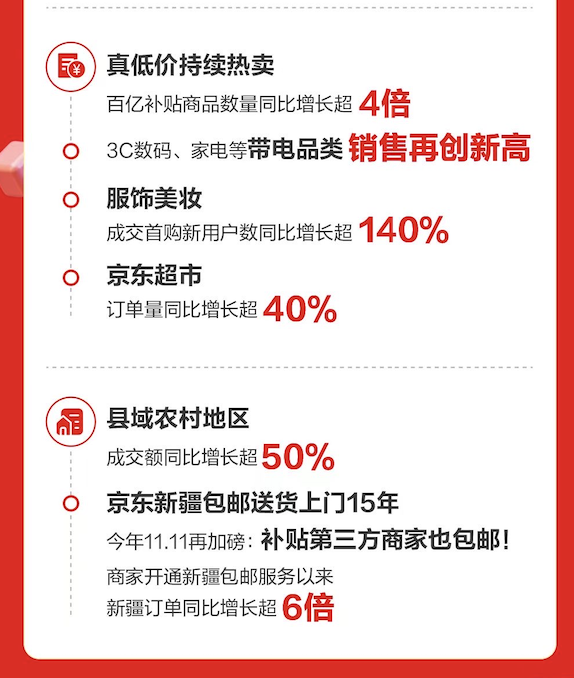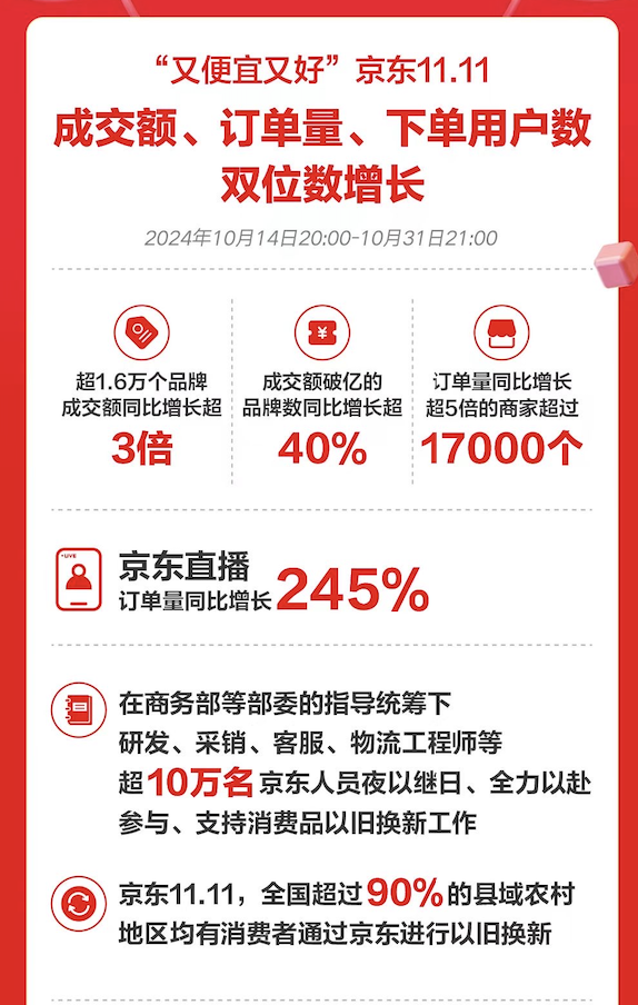 今年京东11.11百亿补贴商品数量同比提升超4倍,服饰美妆成交新用户数同比增长超140%,京东超市订单量同比增长超40%,3C数码、家电等带电品类销售再创新高,京东直播订单量同比增长245%。京东11.11,全国超过90%的县域农村地区均有消费者通过京东进行以旧换新。