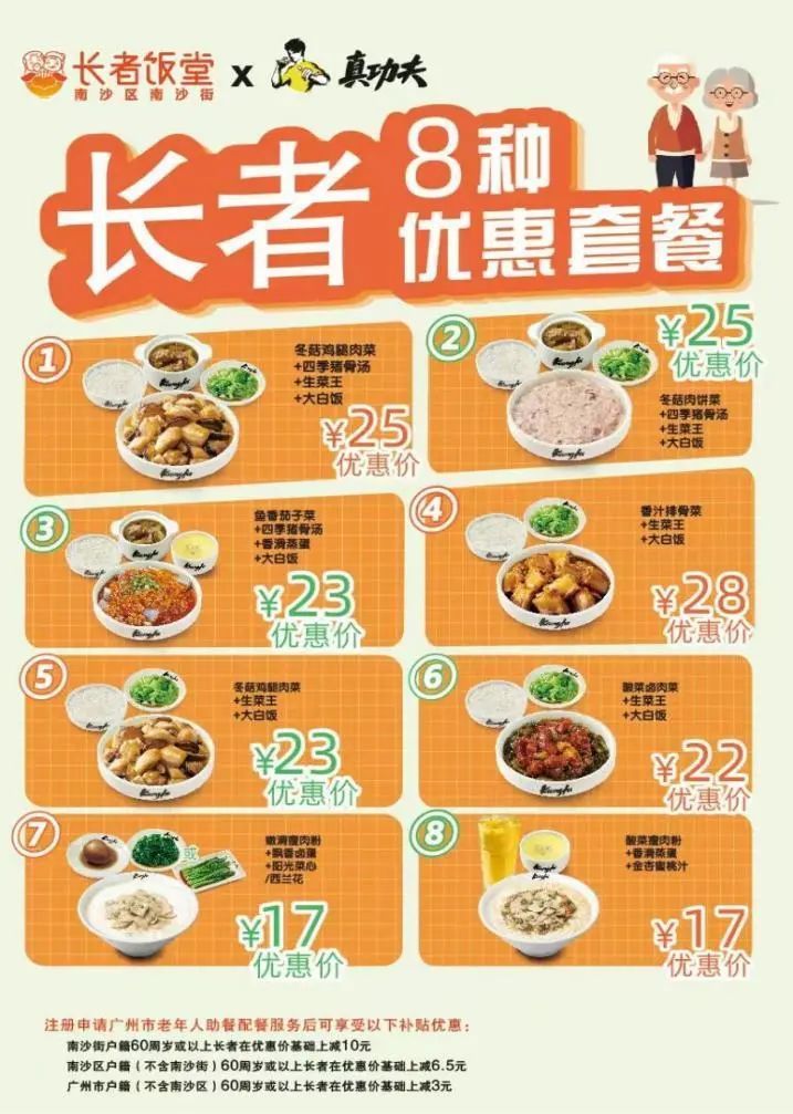 记者在现场看到,门店精心定制多样化餐单,推出了包括冬菇鸡腿、冬菇肉饼、鱼香茄子、香汁排骨、酸菜卤肉、瘦肉粉等8套长者优惠套餐,部分套餐还搭配了猪骨汤,荤素搭配,十分诱人。长者套餐针对持卡老人推出了优惠价,以一款17元的瘦肉粉套餐为例,扣减3元—10元不等的政府助餐补贴,南沙街道户籍的长者只需要7元即可享用,餐费节省超过一半。