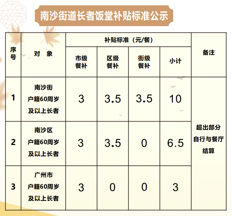 社区饭堂采取“政府补一点、企业让一点、个人出一点”的优惠模式,让老年人群体以最实惠的价格享受到高品质的餐饮服务,广州市、南沙区、南沙街道户籍长者到南沙街道社区饭堂用餐,每餐可分别享受由政府提供的3元、6.5元、10元的补贴。其中南沙街道户籍长者在社区饭堂就餐,每餐可享受由政府提供的10元补贴,配合门店特别推出的优惠套餐,长者的实际负担大幅减轻。
