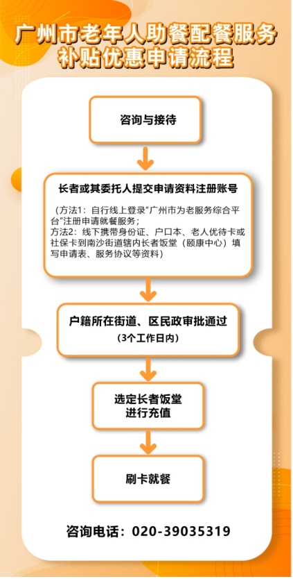 3.还未申请办理就餐服务的长者,别担心!您可以选择线上登录“广州市为老服务综合平台”进行注册申请,或线下携带身份证、户口本、老人优待卡或社保卡,到南沙街道辖内长者饭堂或颐康中心填写申请表、服务协议等资料,同样能享受到这份专属福利。