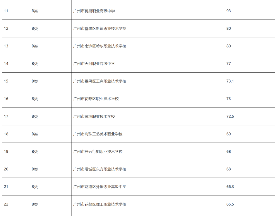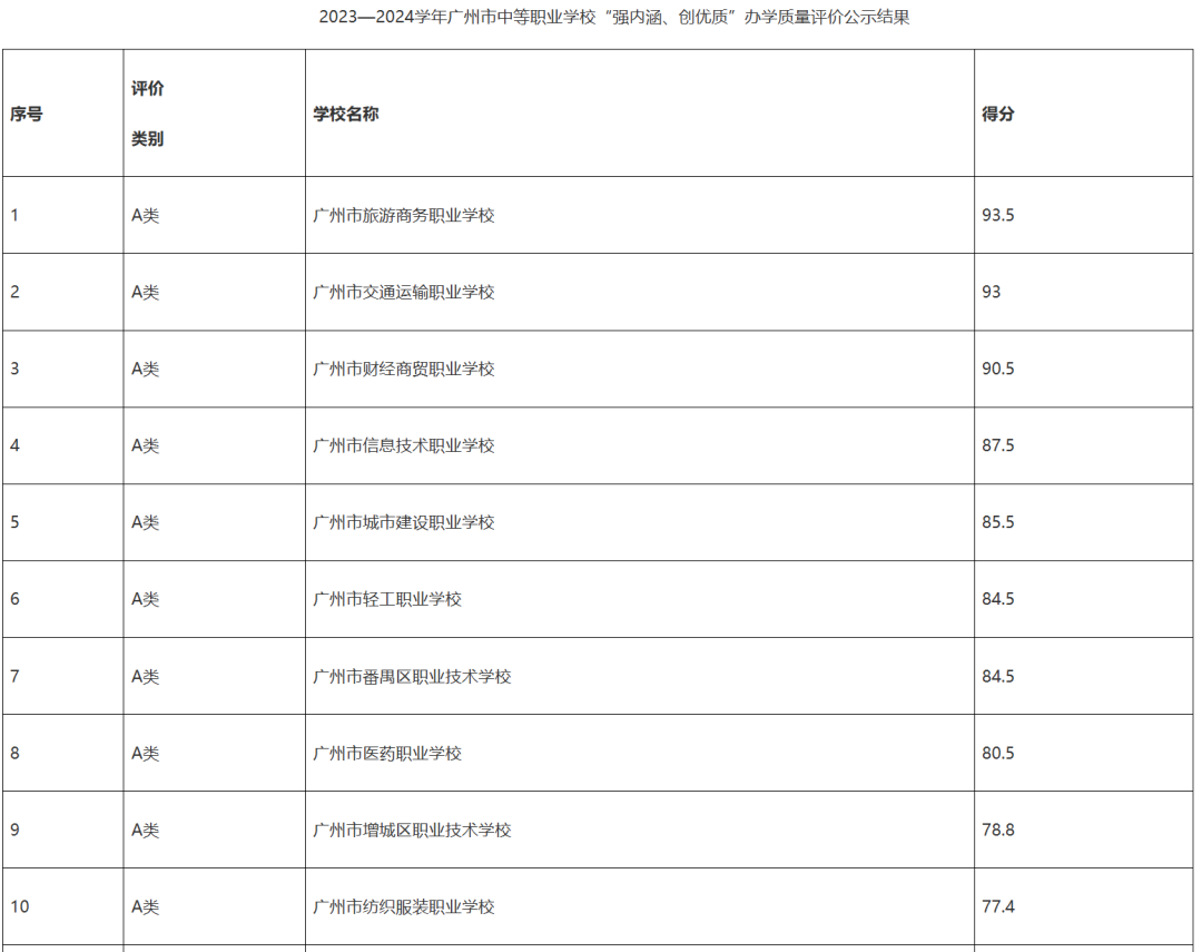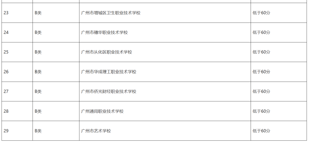 评价结果显示,10所为A类,19所为B类。相比去年,广州市幼儿师范学校、广州市司法职业学校因为被并入其他学校,因此不再参评,同时新增广州市从化区职业技术学校作为参评学校。