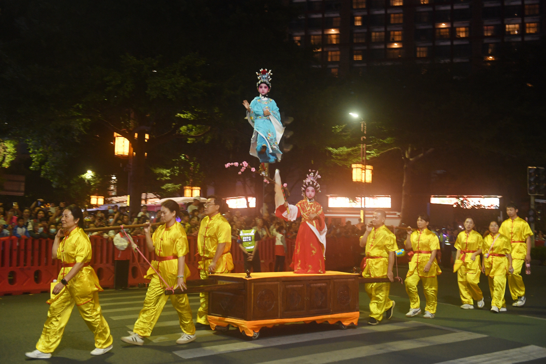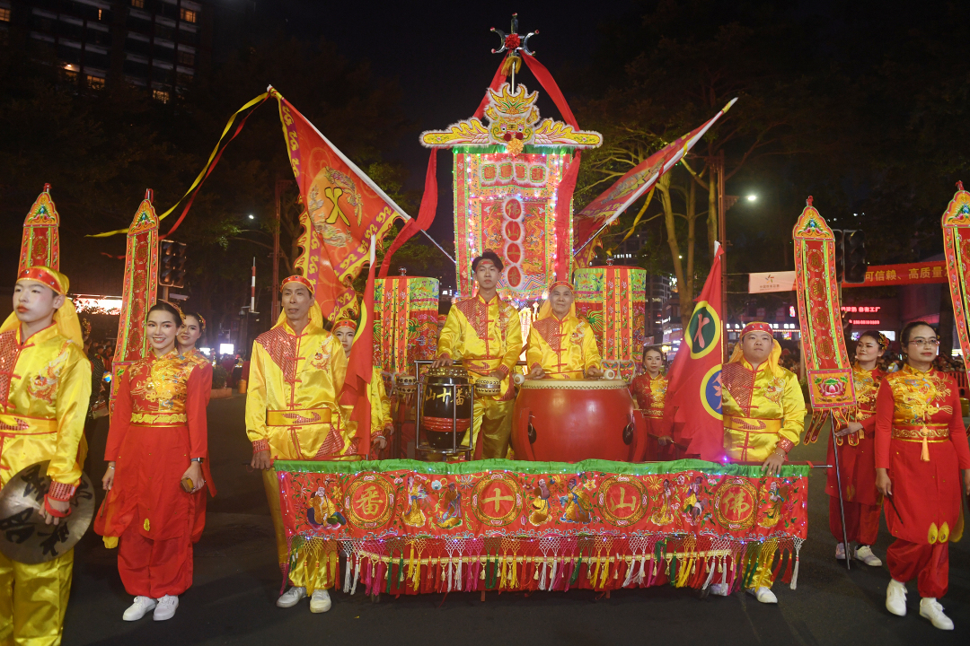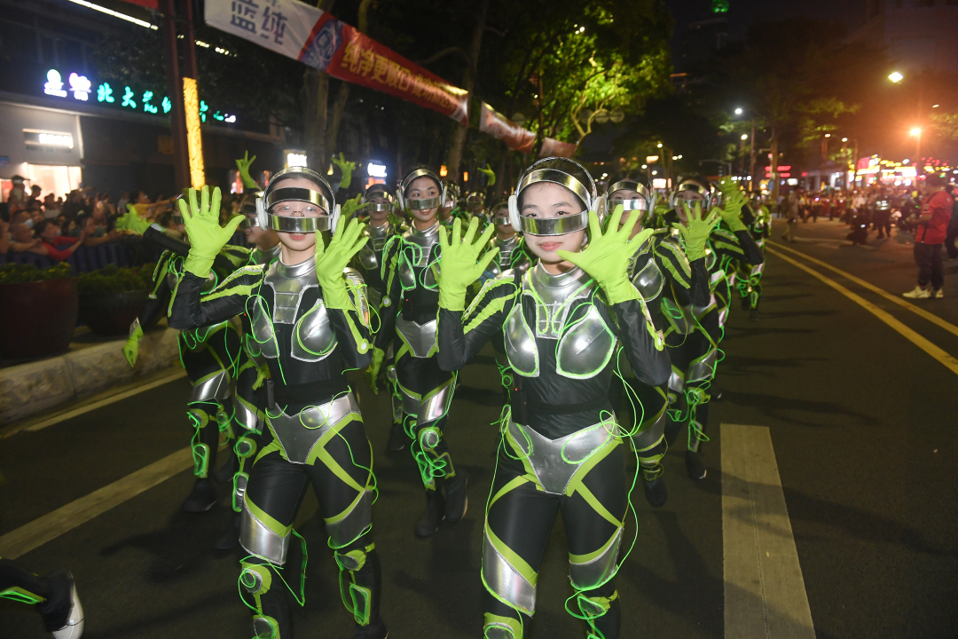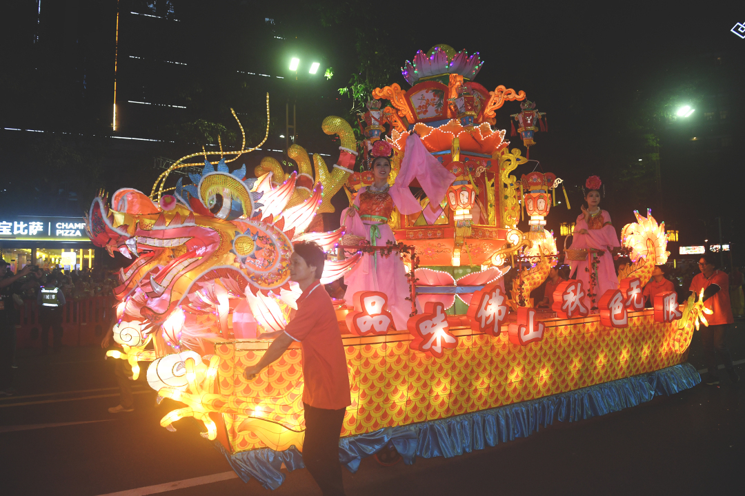 伴随着热闹的锣鼓声,“佛山秋色”信号灯缓缓驶出,一场秋天里的盛会拉开序幕。11月1日晚,佛山祖庙牌坊广场前迎来佛山最大民俗盛会之一秋色巡游。来自粤港澳大湾区、新疆伽师、贵州黔东南州、西藏墨脱、湖南郴州、湘西凤凰等地充满当地风情和民族特色的精彩歌舞,与18辆穿插在巡游队伍里的主题彩车相互辉映,给游客和市民带来一场精彩的视觉盛宴。