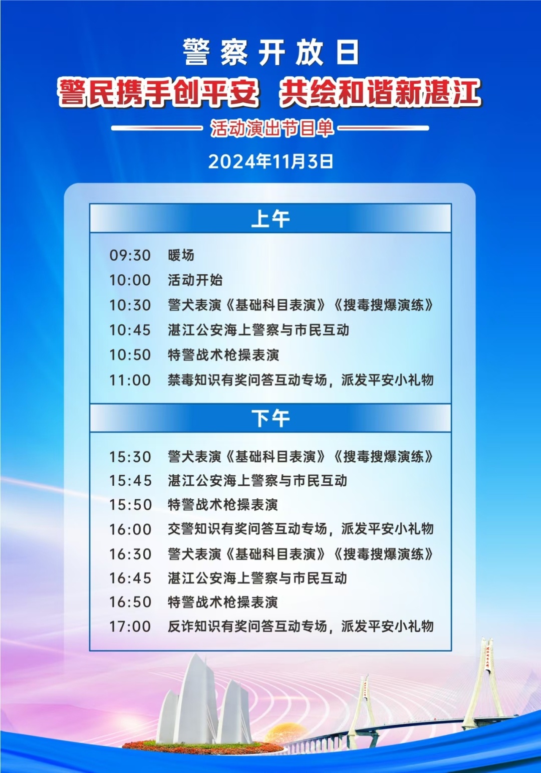 本次警察开放日活动将于2024年11月3日上午10时正式开始,持续到当天下午5时。活动现场将开展特警战术枪操,警犬搜毒搜爆模拟实战演练、人犬互动基础科目训练以及湛江公安海上警察巡逻艇表演等节目。现场还安排了互动环节,由民警围绕禁毒、交通安全、反诈等主题知识现场讲解和有奖问答,让市民朋友在大饱眼福之余,进一步提升自身安防意识,还有机会拿到各种精美的平安小礼物,在打卡点拍照留影。