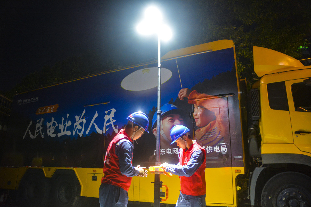 秋色当晚,佛山禅城供电局保电工作人员应急发电前操作无感应急照明灯组,保障应急设备状态稳定