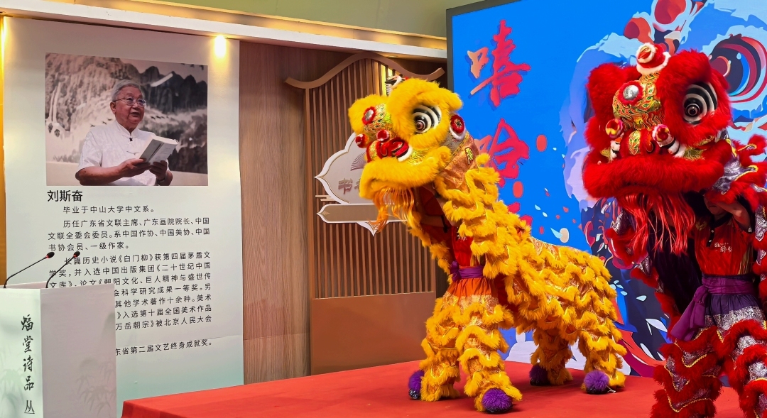 《蝠堂诗品》作者刘斯奋,广东省文艺评论家协会主席田东江、广州新华出版发行集团有限公司副总经理何燕芬等为舞狮点睛开启新书首发式。广东省第十六届运动会南狮项目冠军队伍广东醒狮侠队的《嘻哈狮》现场表演赢得满堂喝彩。