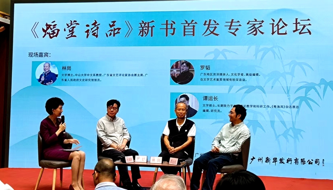 岭南古琴非遗传承人周广怡表演的古琴名曲《碧涧流泉》为活动增添优雅气息。“刘斯奋艺文生涯七十年”系列活动经典回顾视频让在场的嘉宾和读者久久回味。《蝠堂诗品》作者刘斯奋,省人大教科文卫主任委员、广东人文艺术研究会会长刘小毅,省文联二级巡视员、副秘书长梁少锋,广州新华出版发行集团有限公司总经理潘伟志、常务副总经理杨斌,中山大学教授林岗,广州市图批创新中心总经理康芮华等共同为新书首发揭幕。