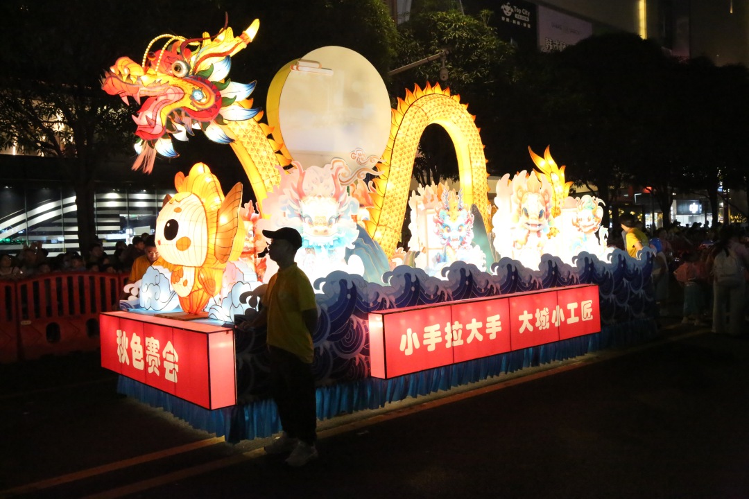 在所有彩车中,有一辆尤为特别,它被一群小小的大头佛簇拥着出场,整体呈现出“海上升明月”的造型。据悉,这是由佛山市博物馆、佛山市非物质文化遗产保护中心设计,名为“九龙闹海”的彩车。彩车前方,彩灯扎制的巨大玩偶“小手非非”流露出可爱的童真,上方栩栩如生的彩龙由灯彩(佛山彩灯)省级代表性传承人陈棣桢及其弟子——市级代表性传承人杨小燕、唐洁容、林燕华、梁凤英等人亲手扎制。在彩龙的身上,一轮明月升起,明月上放映着“2024小手拉大手 大城小工匠”进校园、进乡村、进社区以及暑期班活动的影像资料,成为非遗影像与彩灯艺术相结合的又一次尝试。在彩龙的身边,围绕着8条造型潮流、色彩艳丽的小彩龙,在灯光的照射下,呈现出一派九龙闹海、彩云追月、普天同庆的景象。