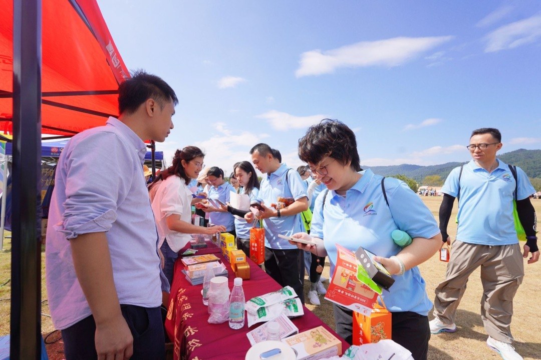 在健步走活动的终点,趣味集市人流涌动。火龙果、百香果、海鸭蛋、源气蜜桃饮料、无糖茶饮料、灵芝孢子油……活动现场各式农产品,及广州鹰金钱食品集团有限公司、广州市供销合作总社等单位的惠民产品琳琅满目,供职工任意挑选。