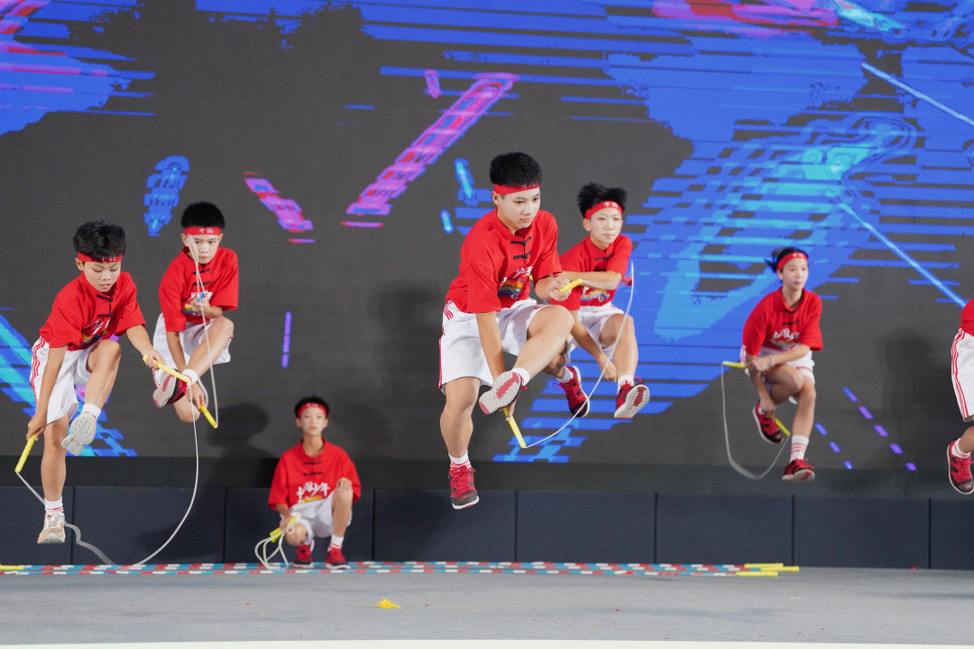 全国五一劳动奖章获得者赖宣治带领的花东学校跳绳冠军团队现场表演花式跳绳,赢得阵阵掌声,将气氛推向高潮。