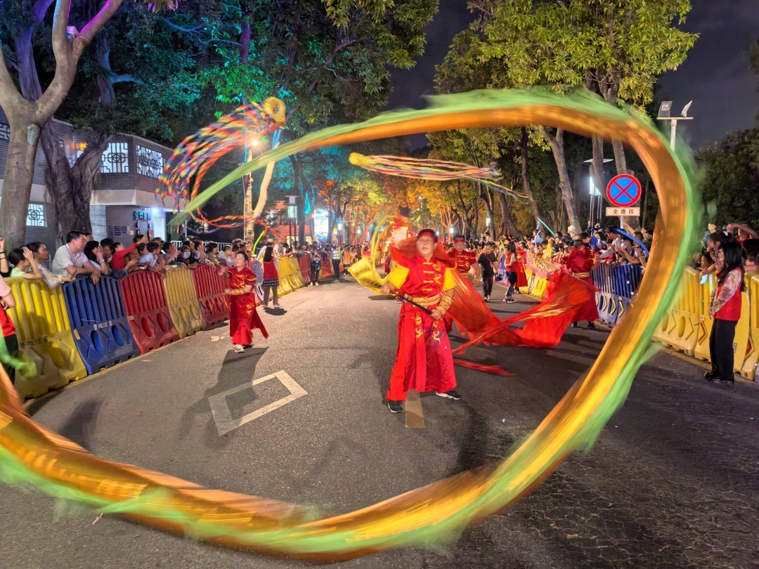 11月2日晚,灯火璀璨,万人空巷!随着锣鼓声,秋色信号灯队伍领头,巡游出发!灯色、车色、景色、马色、水色、飘色、地色,传统“七色”相继亮相。50个表演项目、18辆彩车,队伍浩浩荡荡,让市民游客大饱眼福,一边感受岭南文脉的魅力,一边体验西樵老街的秋色精彩夜生活。现场巡游队伍周边人头涌动,表演者与观众零距离互动,引起市民游客阵阵欢呼。