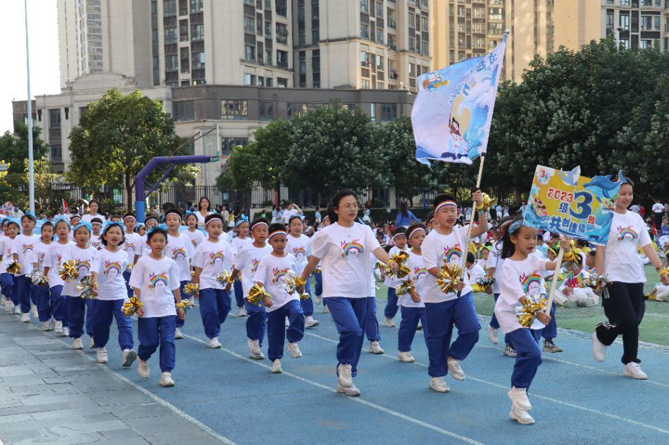 灵秀小学校长黄梦凌介绍,校内的体育活动不仅是学生展示体育风采的舞台,更成为家校社三方合作的纽带。足球是灵秀小学特色体育项目之一,每年5月校园足球联赛由家长参与带领组织,确保每个班级都能参与。学校还成立了啦啦操、健美操、匹克球等体育社团,新建游泳池投入使用后,学校还将成立游泳社团,以多样化的项目激发学生运动兴趣。
