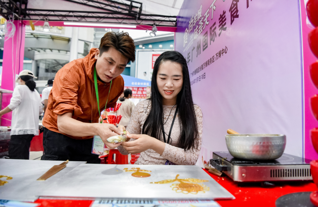 在非遗糖画摊位,糖画非遗传承人为2024年广州国际美食节制作了滋味羊的糖画,达人体验了糖画制作。鱼鱼是一名手工达人和海外博主,她从小红书上看到了2024年广州国际美食节Citywalk的活动信息,她说:“当时看到信息就很感兴趣,今天来到现场,也了解了很多以前不知道的事情,学习了糖画制作,品尝到了不同地域的美食。”