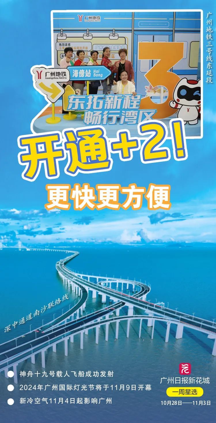11月1日,广州地铁三号线东延段正式开通运营,与四号线实现换乘。线路全长9.6公里,共设傍江站、石碁南站、海涌路站、海傍站4座车站。详情>>>正式开通运营后,不仅沿线居民出行提速,四号线南段乘客也因此受惠,进市区多了一个更快的出行选择。在开通运营的第一个早高峰,列车在起点站海傍已经坐满,昔日的起点站——番禺广场站开始采取限流措施。详情>>>随着新增与四号线的换乘,三号线一共可以和12条地铁线路(不含城际和APM线)换乘,堪称广州地铁的“换乘王”。10月31日,广州市发展改革委会同市交通运输局印发《广州市发展和改革委员会 广州市交通运输局关于优化调整巡游出租汽车运价的通知》(以下简称《通知》),对广州巡游车运价机制进行优化。《通知》自今年11月30日起施行。《通知》指出,出租车起步价、续租价、候时费将实行动态调整,出租车企业可自主选择运价浮动时段和幅度,高峰期运价可选择不上浮、上浮10%、上浮20%、上浮30%,平峰期运价可选择不下浮、下浮10%、下浮20%、下浮30%四档浮动幅度。同时,增设春节附加费10元。10月30日凌晨,神舟十九号载人飞船发射取得圆满成功。详情>>>