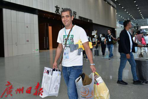 客商双手提满了购买的展品。