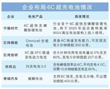 “充电5分钟,续航300公里。”今年以来,市场上不断有消息传出,多家公司已经研发出具备6C超充倍率的电池技术。不仅宁德时代和欣旺达等动力电池制造商推出了6C超充新品,广汽、奇瑞等汽车制造商也在积极布局高倍率超充电池领域。