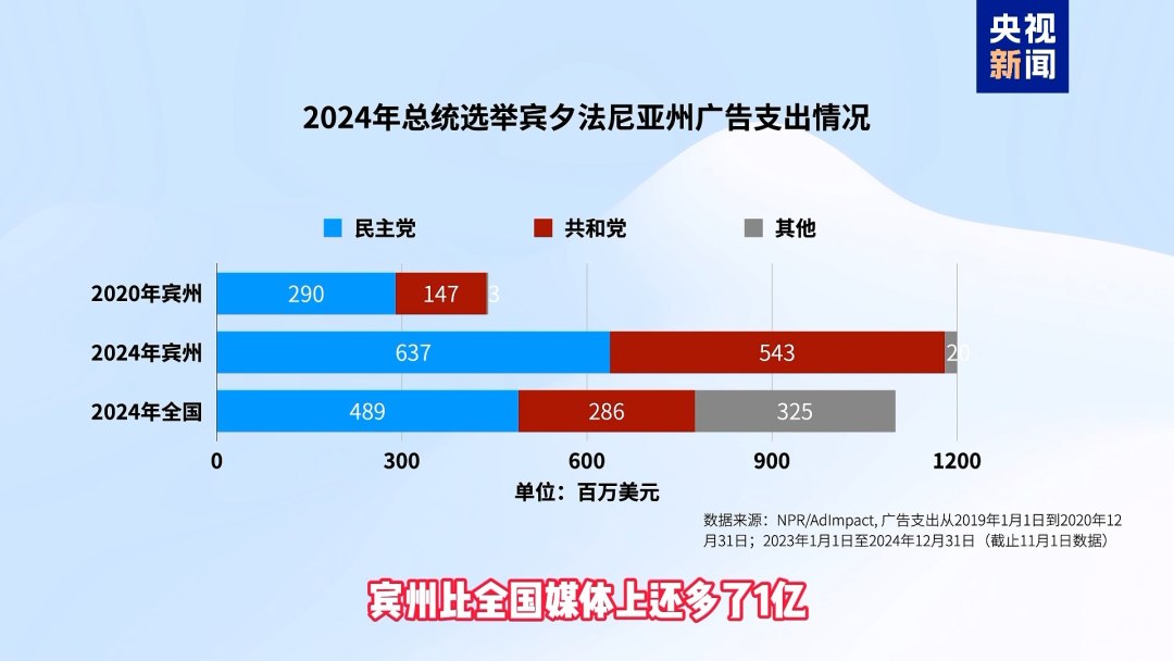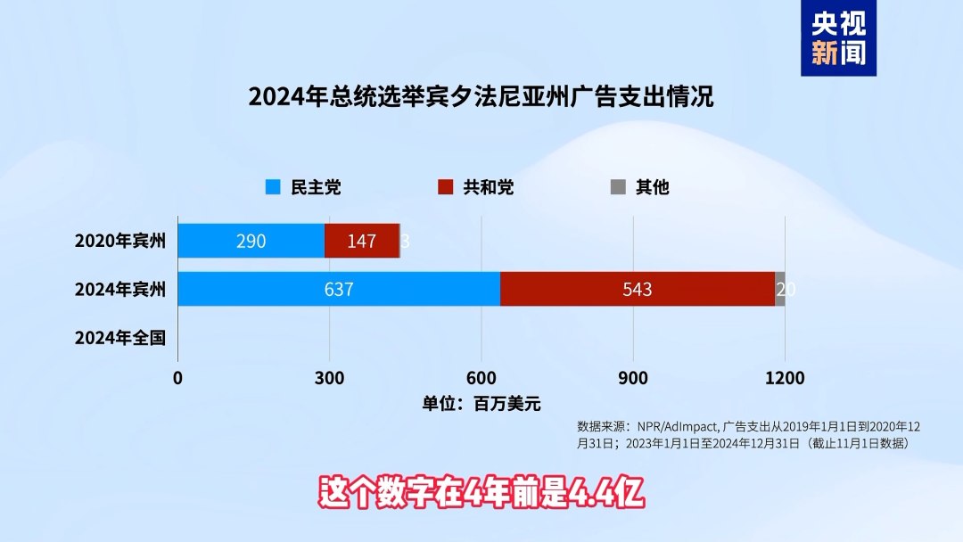 此外,根据美国媒体统计,整个2024年民主、共和两党砸在竞选广告里的资金已经达到了105亿美元,比4年前多了整整10亿。其中,仅仅在宾夕法尼亚,两党总共投入了12亿美元,这个数字在4年前是4.4亿。在宾州到处都是竞选广告。