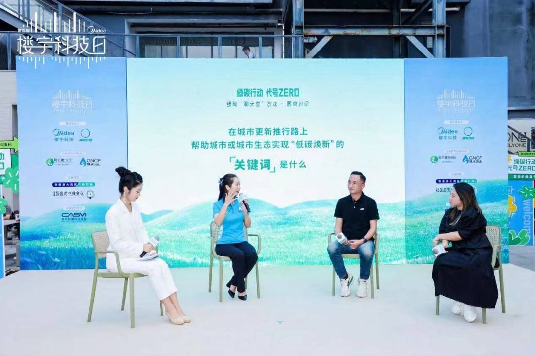 活动现场,美的楼宇科技事业部解决方案与交付总监杨鹏宇、阿拉善SEE珠江项目中心工委副主席张亚娟、阿拉善SEE珠江项目中心区域代表兼项目总监陈思远、气候行动公益组织主理人代表谢若琪以及重要合作伙伴安踏品牌代表一起围绕城市更新、绿色实践、“0碳”未来展开圆桌讨论,分享各自在探索低碳发展路上的前沿趋势与实践路径,描绘城市生态的绿色焕新未来。