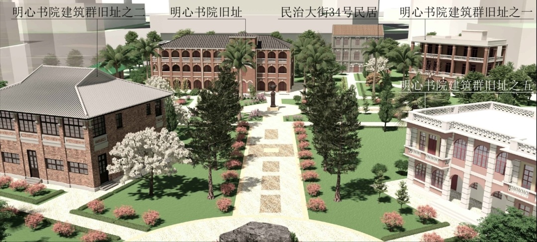 但建筑群经多个建设时期,整体格局及历史环境已不复存在,建筑风貌较差,建筑质量不佳。本次规划提出,为恢复完整的明心书院历史风貌,讲好明心故事,拟对明心书院旧址、明心书院建筑群旧址之二、之四、之五、之六、民治大街32号民居、民治大街34号民居等7处历史文化遗产进行原址修缮,将明心书院建筑群旧址之一、之三2处历史建筑迁移至明心书院旧址周边,实现明心书院建筑群的整体保护和活态传承。