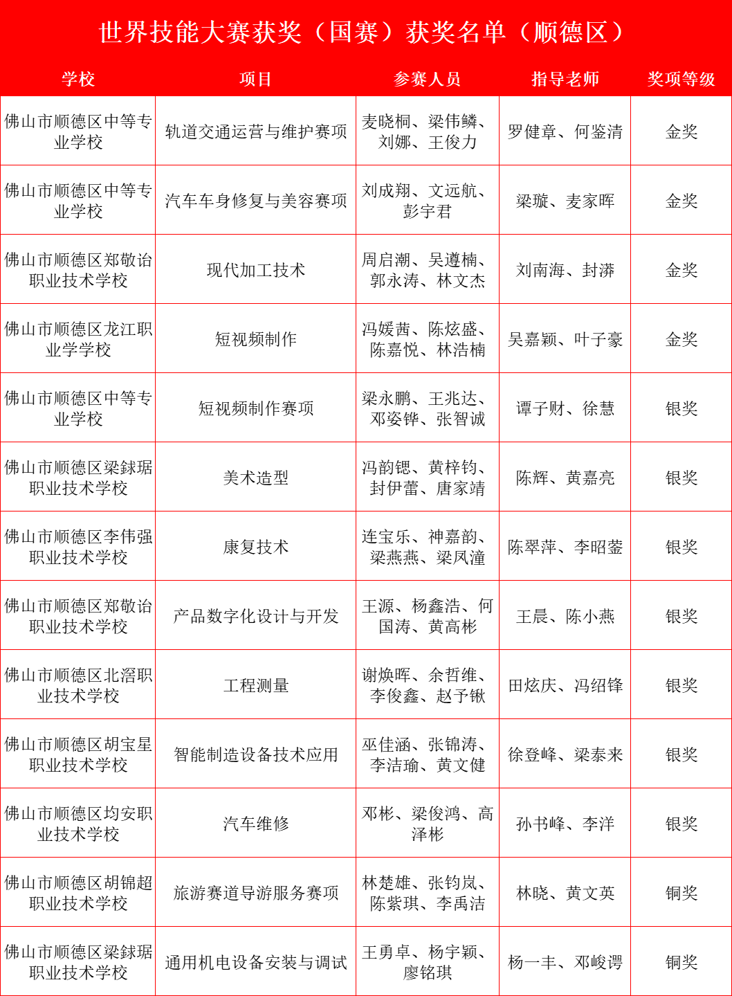 各校表现可圈可点。例如顺德区中专技工学校斩获两枚金牌一枚银牌,首枚金牌来自城市轨道交通运营与维护赛项,由该校城市轨道交通运营服务专业三名学子合力斩获。此外,顺德区龙江职业技术学校则在新闻传播赛道短视频制作组中斩获金奖,并以总分第一名成功晋级2024年世界职业院校技能大赛总决赛排位赛,成为佛山市首个跻身该赛事排位赛阶段的团队。